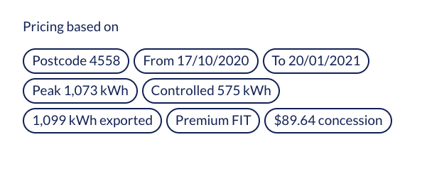 In this example we can see that the prices for the alternative plans are calculated on basis of Postcode 4558 location - meaning the Energex distribution zone in QLD, a bill period starting 17/10/2020 and ending 20/01/2021 inclusive, Peak consumption of 1,073 kWh, Controlled Load consumption of 575 kWh, Solar exports of 1,099 kWh, Premium FiT tariff, and a Concession of $89.64