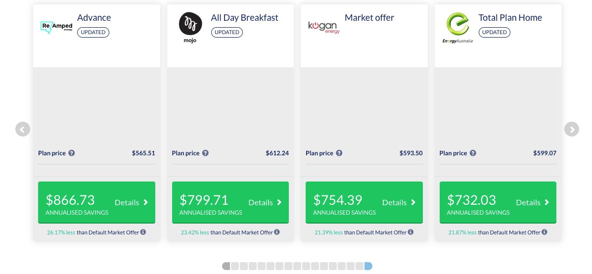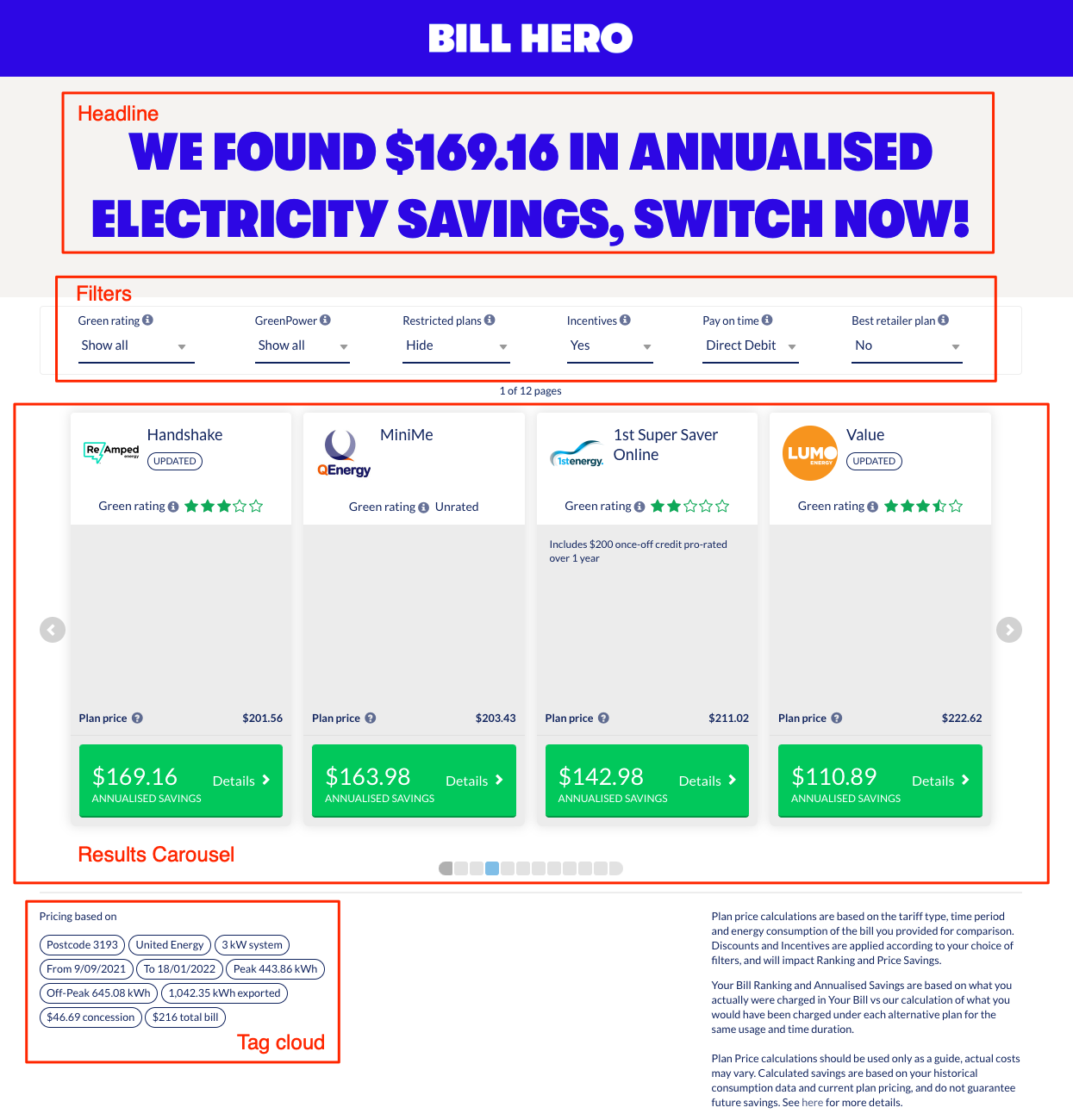 Bill Hero displays the results ranked by price in a horizontal carousel if you're on a computer, or in a vertical list if you're on a mobile. Each plan in the comparison is represented by a card that shows the plan name, the retailer, any additional relevant details about that plan, and the calculated annualised savings available to you under that plan. The plan with the greatest savings for you is at to top of the list of ranked results.