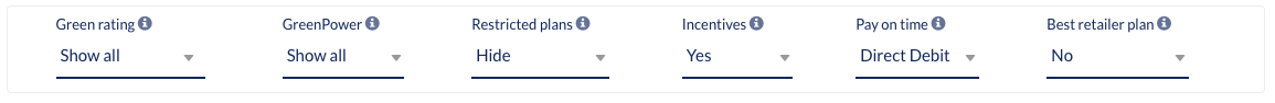 Your results will load by default with the 'Show all' setting enabled. You can use this filter to narrow down the set of retailers. Plans will be ranked by price within the Green filter setting you choose, so it's easy to find the best priced plan that also meets your Green ranking requirements.