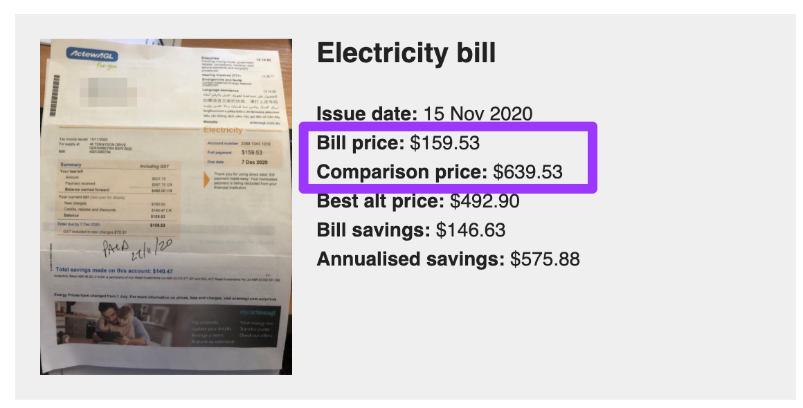 Bill Hero sends an email with a summary of the results found for each bill processed, which includes Bill price, and Comparison price.
