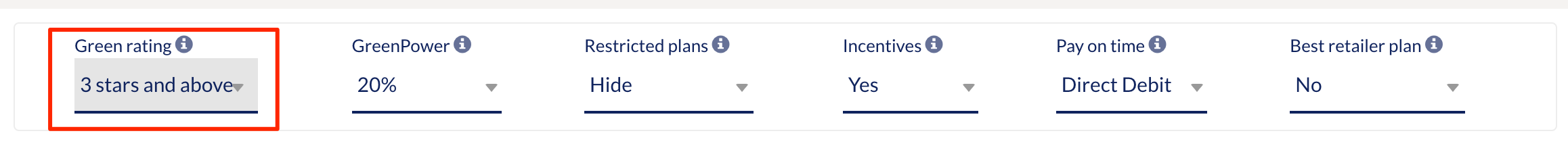 The Green-filtered set of plans displayed will be ranked by price, so this provides a mechanism to identify the best priced plan for you that also meets or exceeds your chosen minimum Green rating.