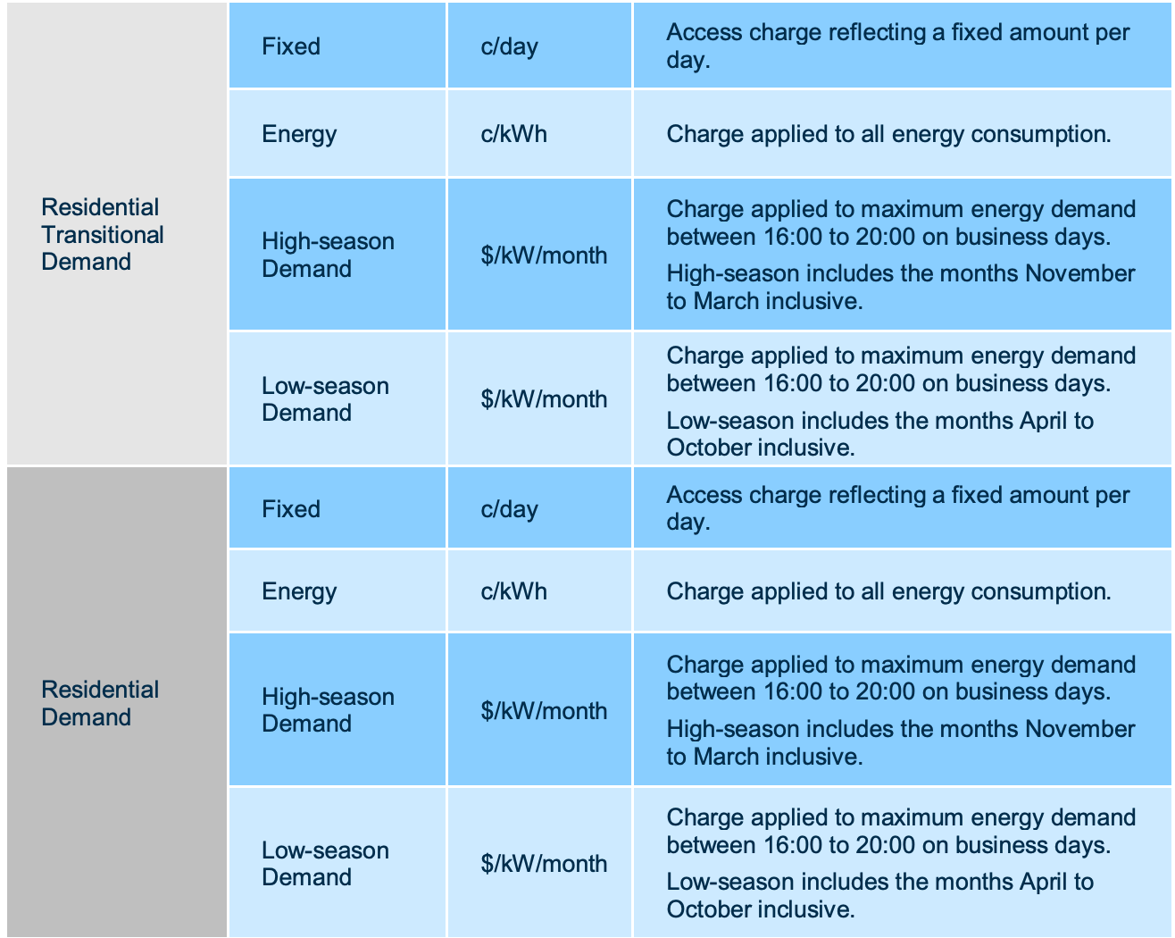 Endeavour’s demand tariffs consist of three tariff parameters: a seasonal maximum monthly demand charge, a flat energy charge and a fixed charge.